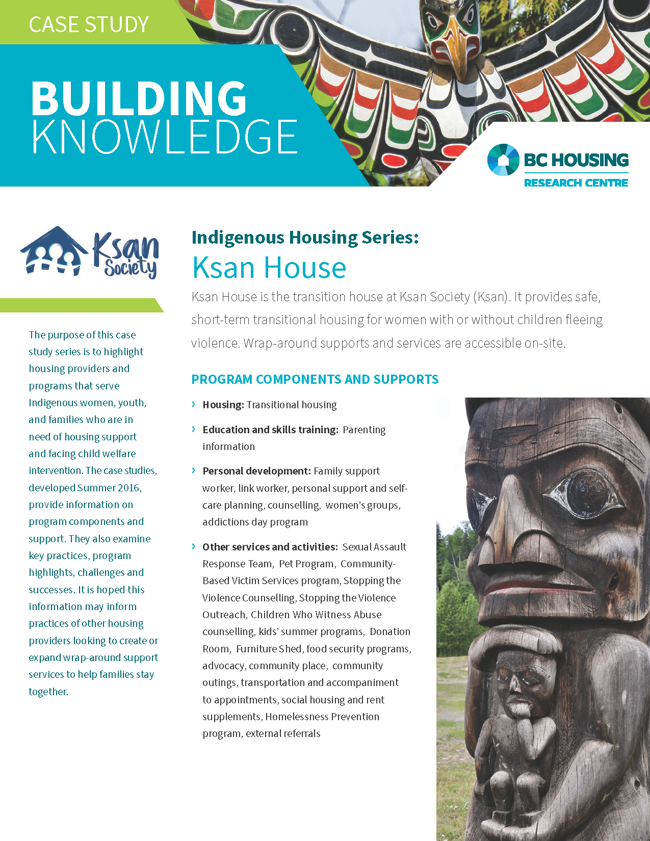 Ksan Society (Ksan) operates Ksan House, a transitional home for women and their children fleeing violence. Wrap-around supports and services are accessible on-site.
